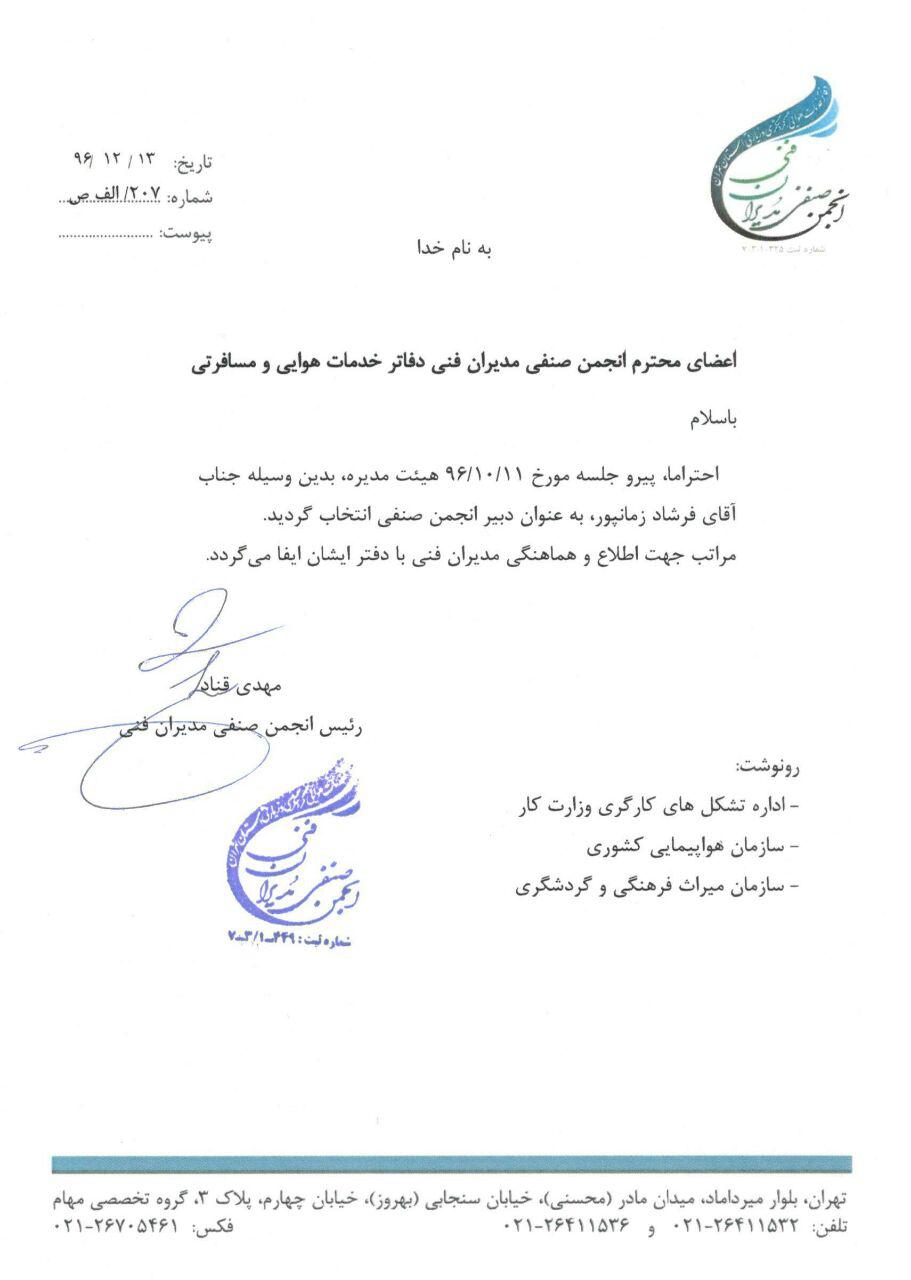 حکم انتصاب جناب آقای مهندس فرشاد زمانپور به عنوان دبیر انجمن صنفی مدیران فنی دفاتر خدمات هوایی و مسافرتی